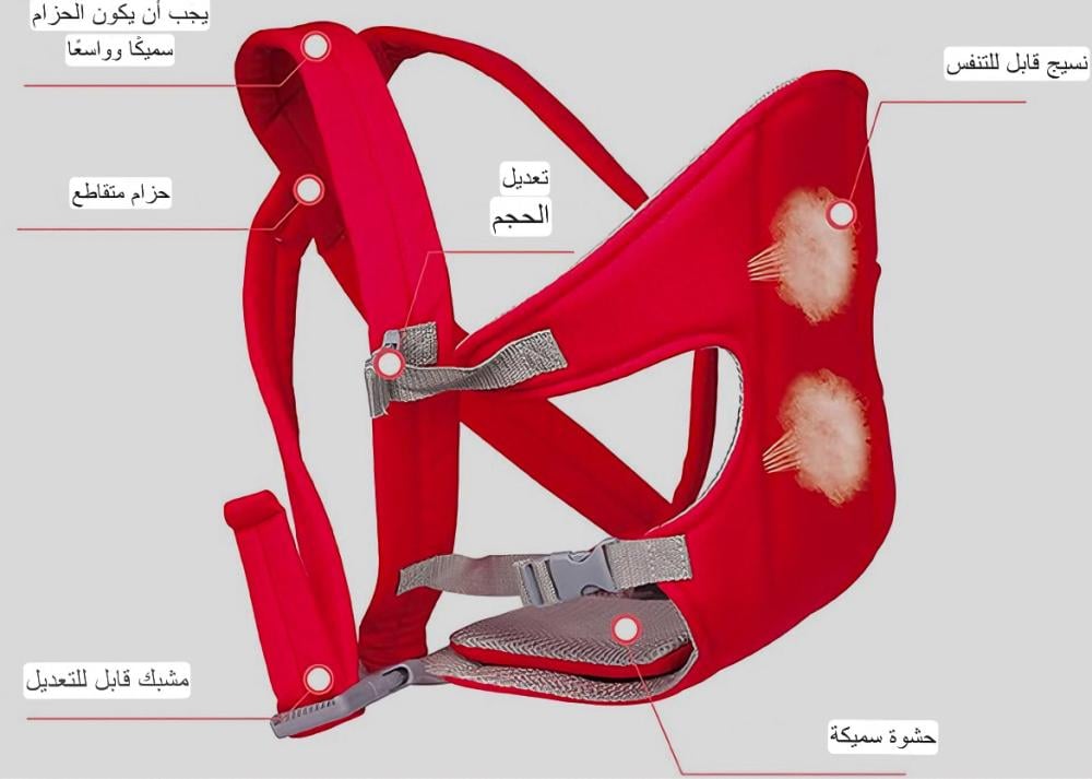- الشيالة مزودة بحزام دعم ظهر مريح يساعد في تقليل الضغط على العمود الفقري عند حمل الطفل لفترات طويلة.
